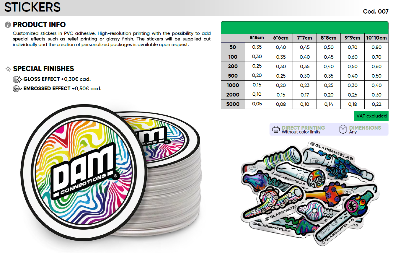 Customized stickers in PVC adhesive. High-resolution printing with the possibility to add special effects such as embossed printing or glossy finish. The stickers will be supplied cut individually, and the creation of personalized packages is available upon request.